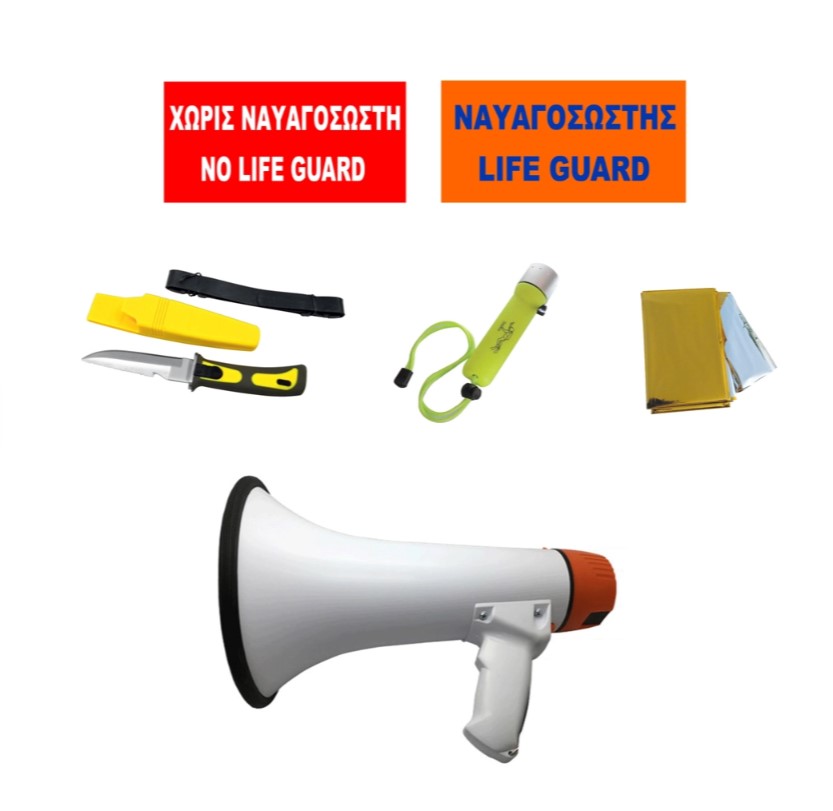 1x Σημαία χρώματος ερυθρού, ίσων διαστάσεων με την προηγούμενη, με την ένδειξη ΧΩΡΙΣ ΝΑΥΑΓΟΣΩΣΤΗ και, κάτωθεν αυτής, την ένδειξη ΝΟ LIFE GUARD, λευκής απόχρωσης