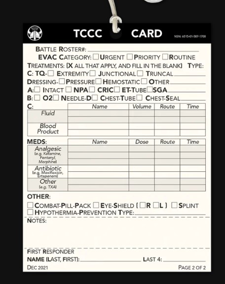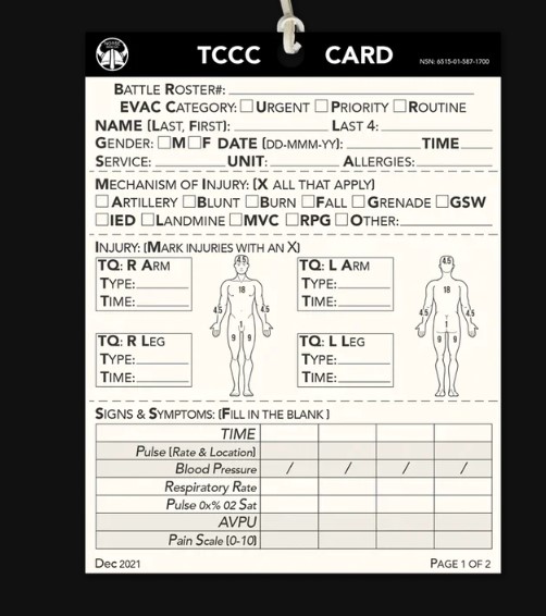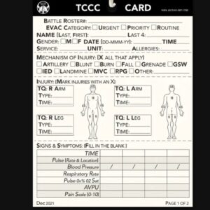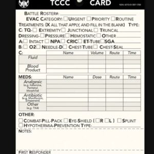 The card is a standardized method for documentation of casualty care in the prehospital environment for battle and non-battle injuries. It comes in waterproof paper and is of solid quality that wont rip easily.